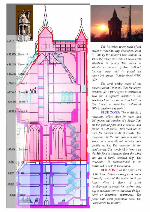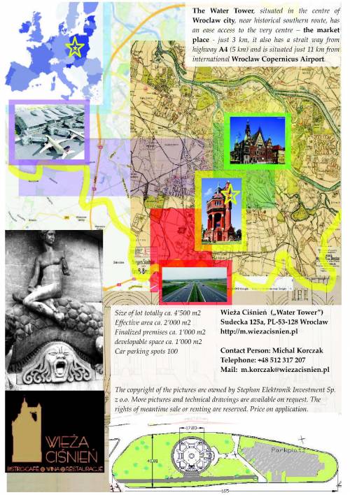 Zabytkowa wieża ciśnień, zbudowana z czerwonej cegły we Wrocławiu w 1905 roku przez Architekta Karla Klimma. W 1995r. wieża została pieczołowicie odrestaurowana i w dolnej części przystosowana pod działalność gastronomiczną. Wieża jest usytuowana na powierzchni około 300m2 na działce o powierzchni około 4500m2.