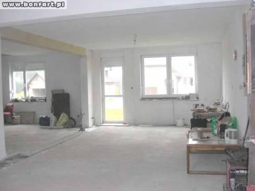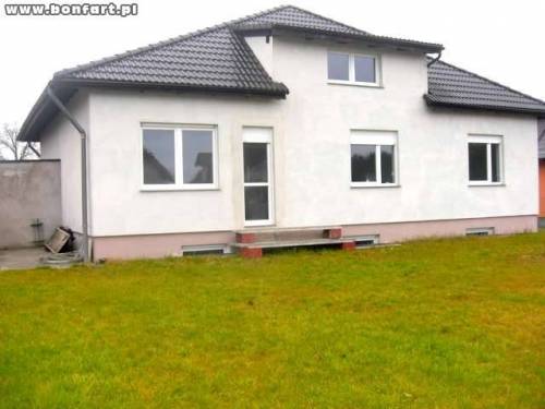 Dom typu bungalow z dostawionym do budynku garażem, całkowicie podpiwniczony o powierzchni użytkowej ok.150 m2 plus garaż o powierzchni 40 m2. Dom parterowy na działce o pow.800 m2 obejmuje salon, 3 pokoje , kuchnia, łazienka, wc, korytarz. W części piwnicznej znajduje się odrębne mieszkanie o powierzchni 55 m2, kotłownia, pralnio- suszarnia, pokój gospodarczy i wc. Poddasze nieużytkowe zostało przez właściciela podwyższone i mogłoby w miarę potrzeby być użytkowanym. Dom wybudowano w technologii murowanej z pustaka z domieszką keramzytu o nazwie "Politak" i docieplono 10 cm styropianem. Posadzki docieplone styropianem, ściany zostały otynkowane tynkem cementowo-wapiennym ,instalacja elektryczna rozprowadzona. Do położenia instalacja hydrauliczna. Kanalizacja jest doprowadzona do domu, gmina w ostatnim czasie położyła gazociąg