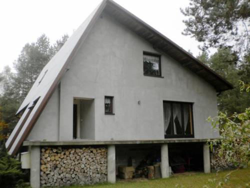 Dom z zewnątrz jest otynkowany, dach pokryty blachą.