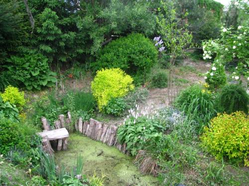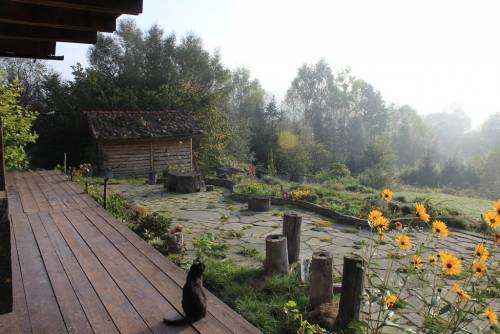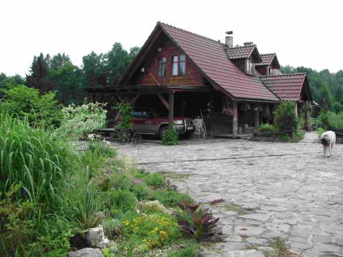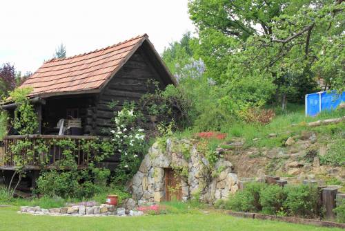 4. Domek dla gości: zbudowany z bali starego spichlerza przeniesionego z Podkarpacia, raczej dla młodych gości, z antresolką do spania dla dwóch osób. 3 okna, ogrzewanie żelazną kozą, instalacja elektryczna. Dobre miejsce na wieczorne oglądanie meczu z kolegami lub używanie swoich zabawek, bez denerwowania rodziny. Ja głównie robiłem tu wina. Przed domkiem mały taras z drewnianą barierką ? widok na las i dobry odsłuch szczekania koziołków i czasem rykowiska pod koniec września. Dach kryty starą, czerwoną dachówką ceramiczną.