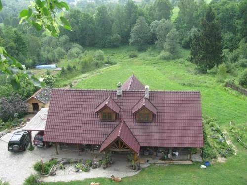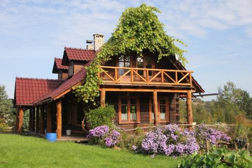 1. Dom drewniany ok 180m2 , 5 pokoi, 2 łazienki, 3 balkony, kuchnia, taras z widokiem na las i sad. Dom zbudowałem w 2000r. z bali drewnianych z 3 starych domów. Główna część (ok. 80%) jest zbudowana z bali domu przyzwoitych ludzi z Podkarpacia budowanego w 1938r. Bale o grubości 14 do 16 cm i wysokości 33-45cm są uszczelnione warkoczem z wełny drzewnej, a od wewnątrz stosowne maty i wełna mineralna o grubości 10 lub 15cm. Dom kryty jest dachówką ceramiczną, ogrzewanie główne to kominek z Spartherm z rozprowadzeniem ciepłego powietrza, dodatkowo 3 grzejniki elektryczne. W lecie w domu jest chłodno, w zimie ciepło. Ciepła woda z podgrzewacza przepływowego 14kW ? można się normalnie kąpać. Okna drewniane, bardzo dobre ze współczesnymi okuciami i szybami zespolonymi. Pod domem piwniczka z regałem na wino z wejściem wewn. domu ? chłodna cały rok. Podłogi głównie z deski drewnianej, olejone, a tam gdzie trzeba ? płytka ceramiczna. Umeblowania prawie nie ma ? tzn. pozostawiam większość zagospodarowania łazienek, zabudowy szaf wnękowych i kilka prostych mebli, ale jeżeli komuś podobałby się styl, w jakim dom był urządzony, to można to odtworzyć rozsądnym kosztem. Przed domem, dzięki lekkiemu, typowemu dla architektury beskidzkiej załamaniu dachu uzyskaliśmy wspaniałą, zabezpieczoną przed deszczem przestrzeń, aby na chwilę usiąść i odpocząć, popatrzeć na świetliki lub pogadać z sąsiadem.