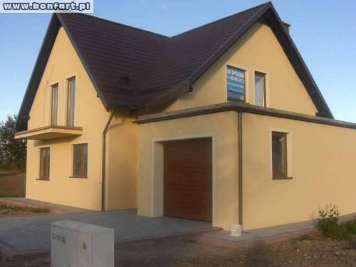 Zbudowany z cegły izotermy 25 cm, docieplony 10 cm styropianem i wykończony tynkiem strukturalnym w kolorze żółtym. Na parterze znajduje się salon z jadalnią o pow, ok 30 m2 , kuchnia, hall, korytarz, wc z pralnią, garaż, kotłownia i składzik na opał.