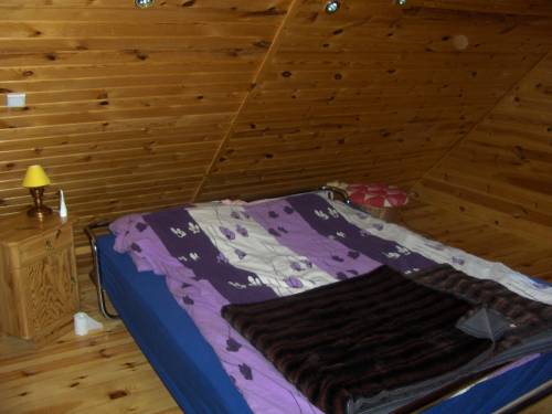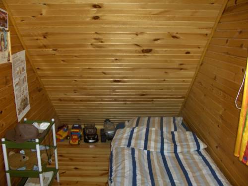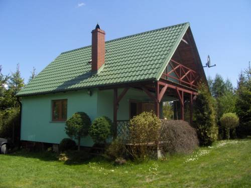 Zbudowany ze szkieletu drewnianego, warstwy sprasowanej waty szklanej i płyt OSB,docieplony 10 cm styropianem i wykończony tynkiem strukturalnym w kolorze zielonym. Na parterze znajduje się duży przestronny salon z aneksem kuchennym oraz łazienką i wc o powiechrzni łącznej, ok 42 m2. Na piętrze znajduje się korytarzyk dwie sypialnie i balkon. Powiechrznia na górze bez balkonu to ok. 36