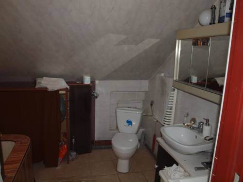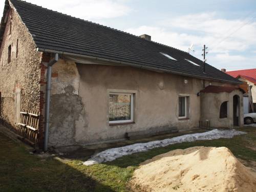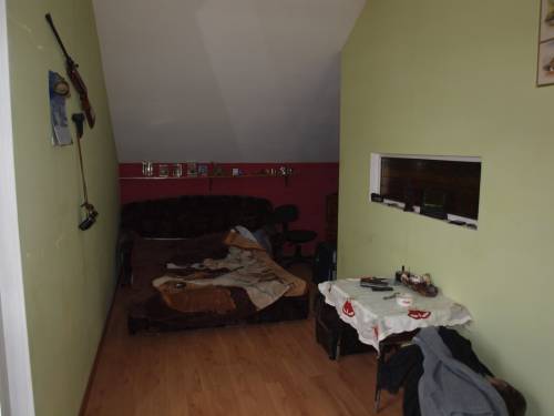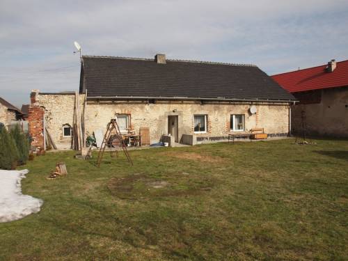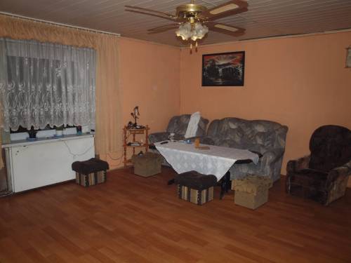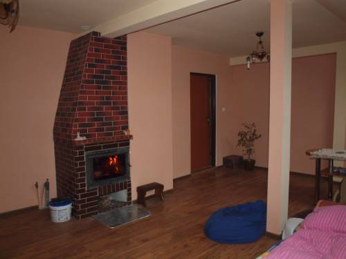 Dom położony na działce 980m2 w kształcie prostokąta. Dom parterowy z poddaszem mieszkalnym i użytkowym. Dach po remoncie, okna plastikowe. Na dole są trzy pokoje, duży salon, łazienka (do wykończenia), wc, korytarz, spiżarnia, kotłownia i garaż. Na górze są dwa pokoje, jeden z aneksem kuchennym i tarasem. Drugi z kominkiem. Łazienka z toaletą. Na poddaszu można zrobić jeszcze dwa pokoje.
