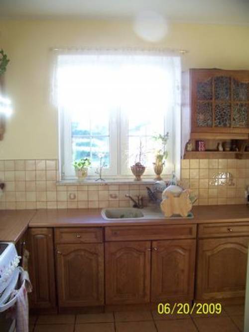 w kuchni terakota, drzwi wewnęrzne-"Porta". Schody na zewnątrz oblożone terakotą. Ciekawa elewacja zewnętrzna. Ogrzewanie