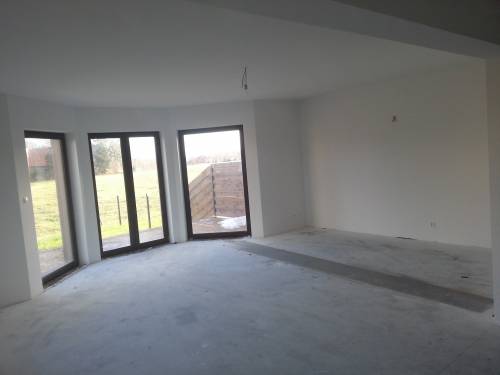obszerny salon z pięknym wykuszem, otwartą kuchnią oraz jadalnią,