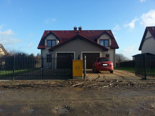 Działka jest w całości ogrodzona, tarasy wyłożone kostką oraz teren