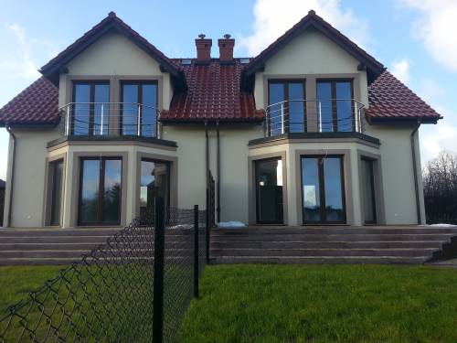 okna w kolorze dębu włoskiego, drzwi antywłamaniowe, alarm, domofon,