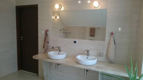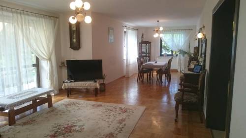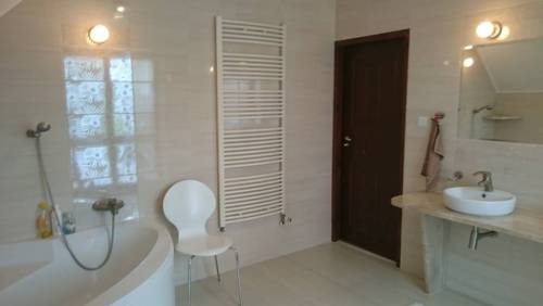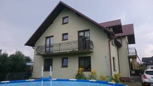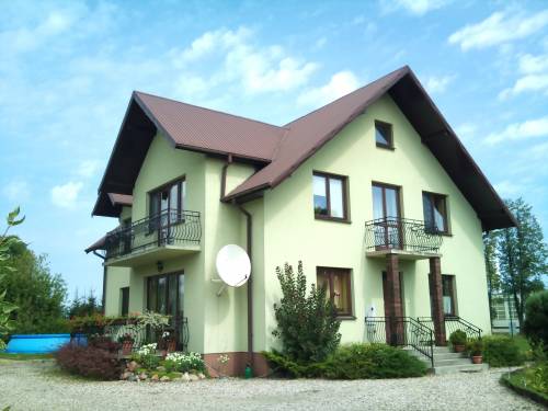 Dom piętrowy, z nieużytkowym poddaszem, ocieplony, częściowo podpiwniczony, wejście przez sień do hallu. Z hallu na parterze dostępne są: duży pokój dzienny (parkiet jesionowy - odświeżany w 2019), gabinet, kuchnia (po gruntownym remoncie w 2019 - nowe szafki pod wymiar, sprzęty AGD) i łazienka. Wejście do kotłowni po zejściu kilkoma stopniami w dół, wysokość parteru 2,80m. Na I piętrze zlokalizowano 3 pokoje sypialne, garderobę, łazienkę i pokój kąpielowy, wysokość piętra 2,50m. Przestrzenny dom dla dużej rodziny. Zwarta bryła nawiązująca do form tradycyjnych, malownicze lukarny poddasza.