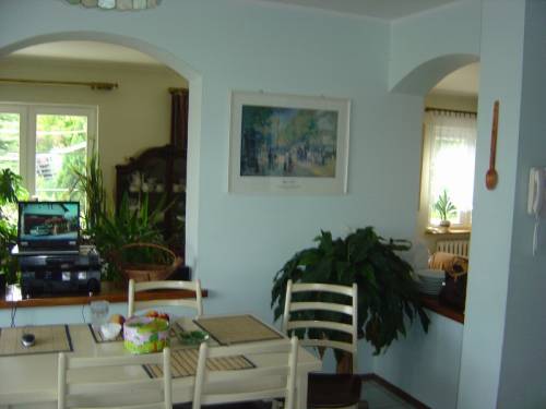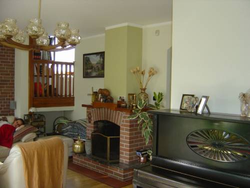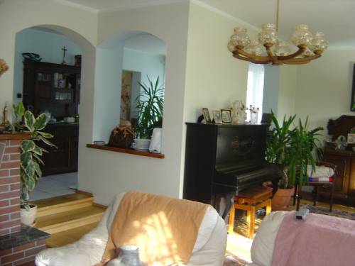Na parterze domu znajduje się salon z wyjściem na taras,odzielny pokój do pracy, kuchnia, jadalnia, łazienka z wc. W salonie kominek. Na pierwszym piętrze usytuowano 3 pokóje, sypialnię, pralnię, garderobę i dużą łazienkę.W piwnicy znajduje się garaż na 2 samochody, spore pomieszczenie gospodarcze oraz kotłownia z piecem olejowym (6000l) ogrzewającym dom. Dom jest z tzw.duszą i można się w nim wspaniale czuć.Od wschodu słońca usytuowano kuchnię, w salonie jest słońce od godzin południowych do samego wieczora.Z salonu jest prosto wyjście na ogród i taras.