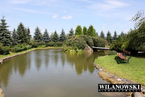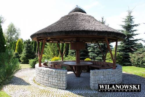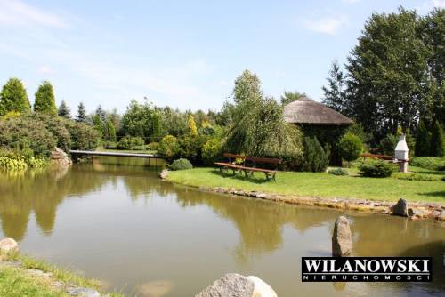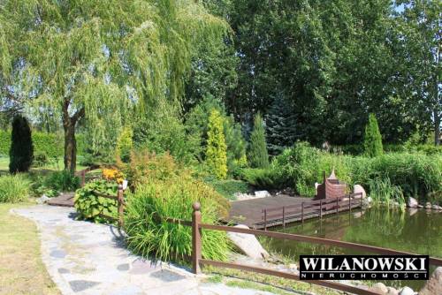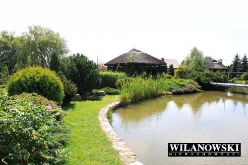 Na działce mieszczą się również dwie drewniane altany oplecione winoroślą pokryte oryginalnym trzcinowym dachem oraz dwa zarybione stawy (raj dla wędkarzy). Na środku większego znajduje się ?wysepka? z ławeczką wśród róż. Z ?wysepki? spływa bystra woda dwiema kaskadami po blokach skalnych. Duży staw łączy mniejszy uroczy strumyk.