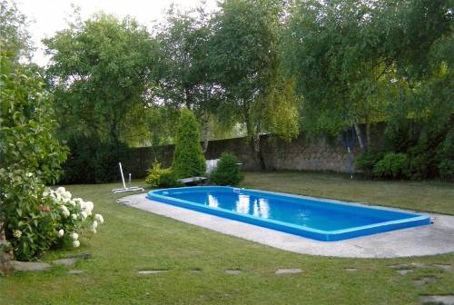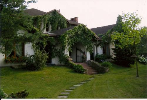Dom znajduje się w malowniczym ogrodzie położonym na działce o powierzchni 21 arów. Cała posiadłość ogrodzona jest kamiennym murem o wysokości 1,5 metra, który nie tylko dodaje niepowtarzalnego uroku lecz jest również wspaniałym sprzymierzeńcem prywatności jej mieszkańców. W upalne dni do Państwa dyspozycji jest basen o wymiarach 3,5 na 9 metrów (oczywiście wyposażony w niezbędne filtry oraz pompy). Oprócz wymienionego wyżej podwójnego garażu, przy podjeździe znajduje się również wiata zdolna pomieścić dwa samochody. Posesja jest wyposażona w alarm oraz ochronę. Materiałem użytym do budowy był pustak, ocieplenie styropianowe, dach został pokryty dachówką tegola. Ogrzewanie gazowe + trzy kominki. Wszystkie okna są nowe- plastikowe.