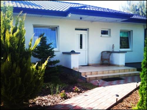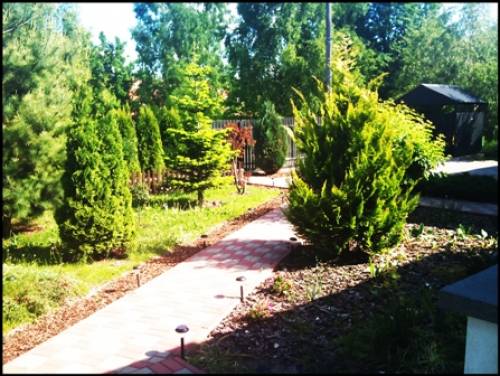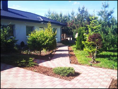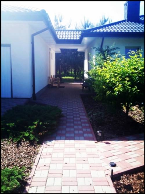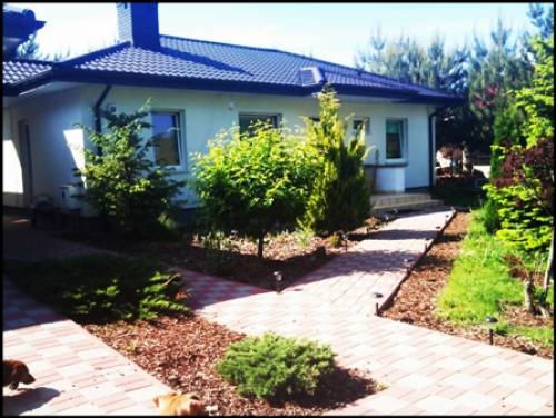 Dom wybudowany w 2006 roku. Materiał budowlany - gazobeton, izolacja przeciwwilgociowa, ocieplenie 12- cm styropianem, tynk mineralny plus opaska klinkierowa. Strop w konstrukcji drewnianej. Strych nie użytkowy. Okna PCV, stolarka wewnętrzna MDF. W domu na ścianach karton gips. Na podłodze w salonie panele, w kuchni i łazienkach oraz części korytarza terakota, w sypialniach i części korytarza przy sypialniach wykładzina dywanowa. Działka wokół domu bardzo ładnie zagospodarowana, dojścia i podjazdy wyłożone kostką. Część terenu to ukwiecony ogród, pozostała część to młody las sosnowy z własnymi grzybami. Nieruchomość ogrodzona z bramą przesuwną na pilota. Dojazd do nieruchomości drogą gminną oświetloną latarniami.
