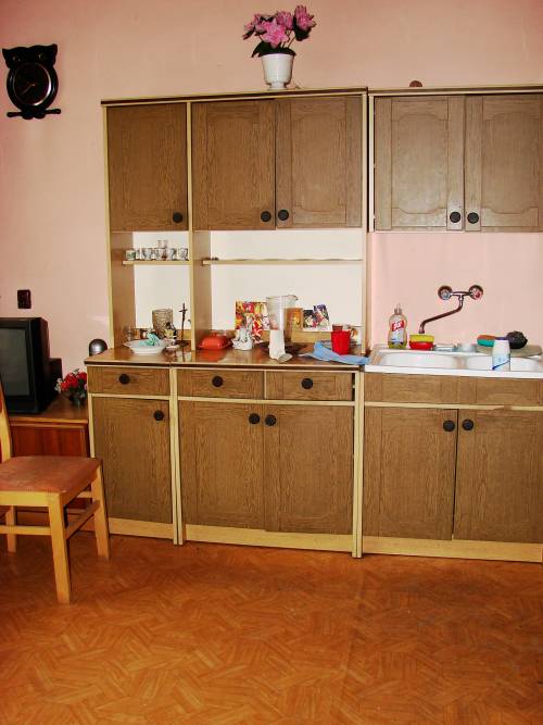 - pokój (4,00 x 3,50 = 14,00 m²); wyposażony w instalację ciepłej i zimnej wody, stąd może pełnić funkcję kuchni