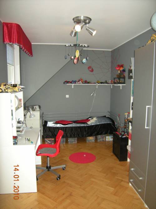Piętro: Pokój dziecięcy 23 m2 parkiet buk, pokój dziecięcy 12 m2 parkiet buk, łazienka dziecięca 5,2 m terakota i glazura, antresola 8,5m2 parkiet buk, sypialnia 12,5 m2, garderoba przy sypialni ? skos 15 m2, łazienka pokój kąpielowy 14 m2 terakota podgrzewana, pralnia 6,6 m2