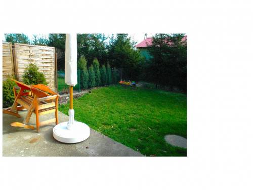 tył: wyjscie na taras betonowy ( do własnej aranżacji ), ogródek obsadzony iglakami ogrodzony siatką drucianą.