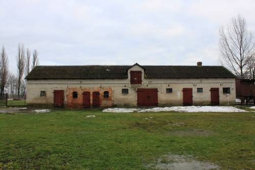 Budynek gospodarczy w bardzo dobrym stanie. Wybudowany z białej i czerwonej cegły. Dach pokryty eternitem.