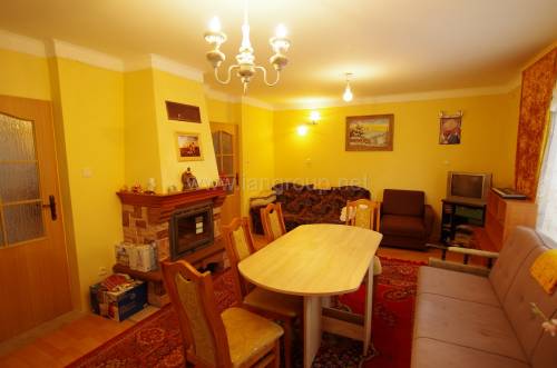 - pokój z aneksem kuchennym i kominkiem,