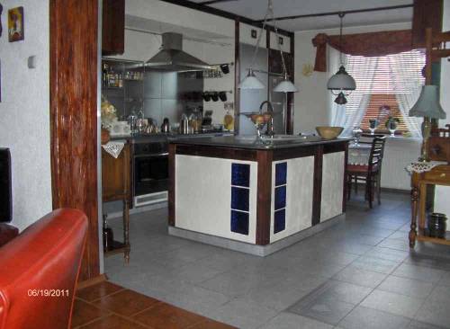 Kuchnia 18 m2 z aneksem, otwarta, na podłodze gres.