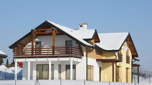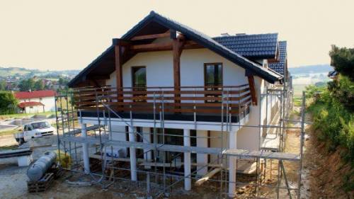 -liczne akcenty drewniane (belki i balustrada na balkonie, elementy drewniane na poddaszu, a także