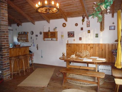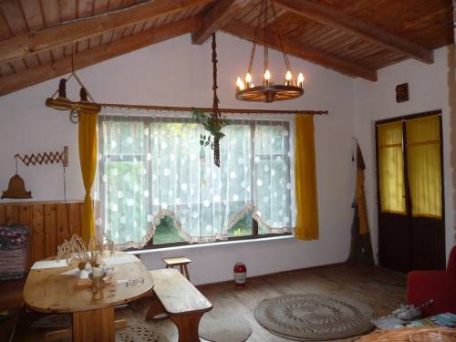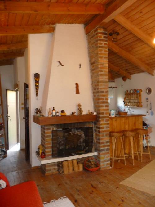 dach lekko skośny pokryty blacho-dachówką. Na powierzchnię użytkową domu składa się kuchnia otwarta na salon z kominkiem, niezależna mała sypialnia, łazienka oraz skrytka gospodarcza. Na podłodze deski sosnowe. W bryle budynku zadaszony taras bardzo dobrze nasłoneczniony.
