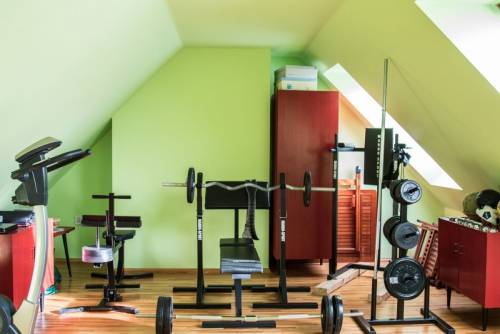 Na drugim piętrze-poddaszu zagospodarowany na siłownię otwarty, przestronny pokój 34 m2 (do własnej adaptacji).