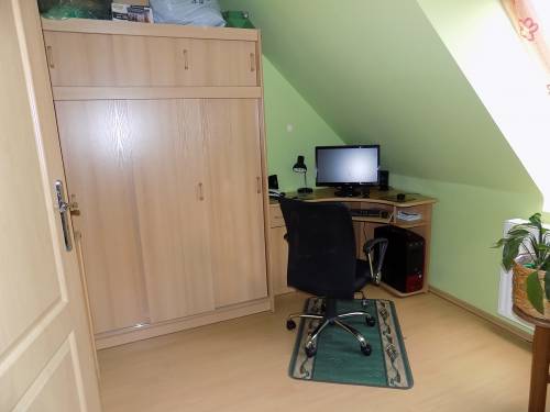 firmy Keramag, Dornbracht(ogrzewanie i ciepła woda z nowego pieca gazowego nisko kondensacyjnego z zasobnikiem Firmy Vaillant) pokój biurowy oraz pokój dzienny. Na korytarzu duża szafa garderobiana.
