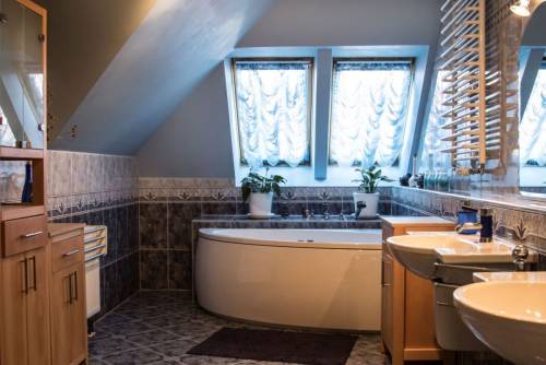 Na pierwszym piętrze znajduje się duża sypialnia, komfortowy salon łazienkowy, wyposażony w wannę z hydromasażem