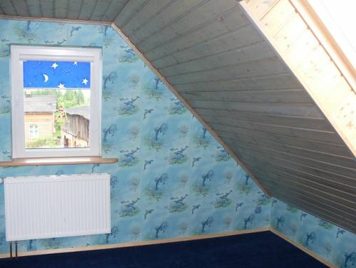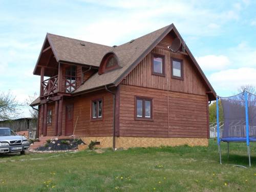 Na poddaszu - wykładziny dywanowe, a na skosach oraz sufitach - boazeria świerkowa. Na zewnątrz dodatkowo: balkon, portyk ok. 4 m2 i zadaszony taras z desek modrzewiowych 20 m2.