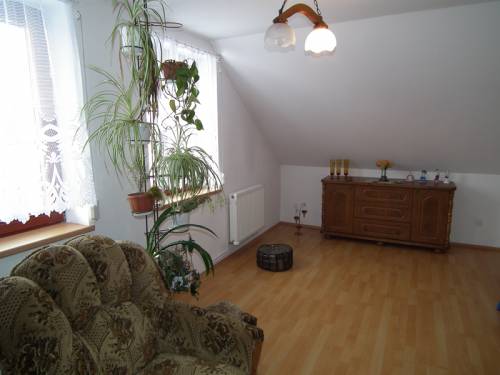 Pierwsze piętro nieruchomości: duża łazienka z prysznicem, sypialnia z balkonem, salono-sypialnia z widokiem na Skrzyczne.