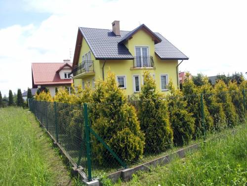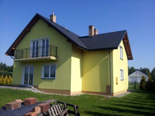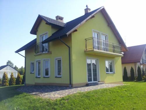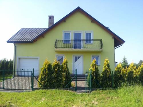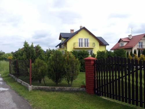 Powierzchnia całkowita domu wynosi 165,3 m2, powierzchnia użytkowa 131,9m2. Działka 8ar - ogrodzona I obsadzona tujami przy całym ogrodzeniu. Garaż. Dom wybudowany metodą tradycyjną z pustaka typu MAX 29, docieplony styropianem gr. 12cm wraz z wykonaną elewacją zewnętrzną. Dach domu kryty blachodachówką firmy Ruuki, strop żelbetowy nad poddaszem docieplony styropianem (możliwość wykonania dodatkowego pomieszczenia), kominy klinkierowe, rynny pionowe i poziome. Okna PCV 5-komorowe firmy PAMOplast, okna dachowe firmy FAKRO, drzwi zewnętrzne antywłamaniowe, brama garażowa segmentowa uchylna bez napędu. W pełni wykończone balkony, metalowe balustrady. Dookoła domu chodnik i taras wykonany z kostki brukowej. Wewnątrz domu wykonane tynki cementowo-wapienne, końcowe wylewki, schody lane betonowe. Rozprowadzona instalacja elektryczna, gazowa, wodno-kanalizacyjna i grzewcza (dodatkowo zainstalowana instalacja ogrzewania podłogowego w łazienkach oraz kuchni).