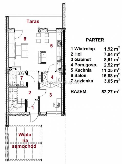 Układ pomieszczeń: PARTER 52,27 m2