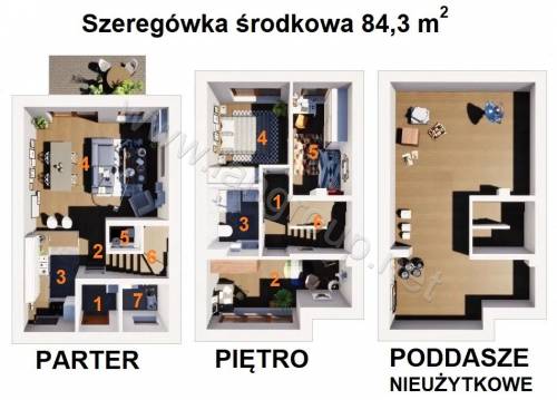 Prezentujemy ofertę sprzedaży szeregówek środkowych o powierzchni użytkowej 84,3 m² + 39,6 m² poddasze nieużytkowe , działka około 1,2 ara .