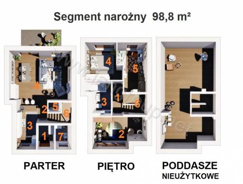 Prezentujemy ofertę sprzedaży szeregówek narożnych o powierzchni użytkowej 98,8 m² + 43,2 m² poddasze nieużytkowe , działka około 3 ary .
