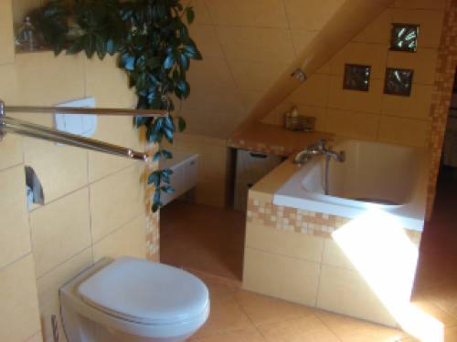 Na piętrze trzy pokoje oraz przestronna łazienka połączona z suszarnią oraz strych.