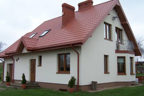 Dom ocieplony styropianem, poddasze i strych ocieplone pianą, dach pokryty blachodachówką, okna trzyszybowe PCV, kamienne parapety wewn.