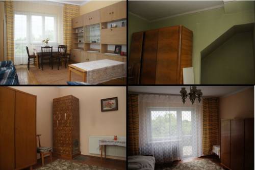 Dom posiada sutereny pod całą powierzchnią (garaż, zsyp węgla, pralnia, warsztat i spiżarka). Na parterze znajdują się dwa pokoje po około 20 m2 z wyjściem na taras na ogród oraz jeden pokój o powierzchni ok. 10 m2 i łazienka. W jednym z pokoi znajduje się ciąg kominowy, do którego wpięty jest piec kaflowy - możliwość wymiany na kominek. W przedsionku drugiego pokoju zaadaptowana aktualnie kuchnia. Na piętrze znajduje się identyczny układ pokoi, z tym że taras znajduje się z przodu domu nad gankiem. Wysoki strych, aktualnie niezagospodarowany. Ogółem powierzchnia użytkowa 150 m2 + piwnice + klatki schodowe ? suma 200 m (parter- 85 m; 1 piętro 70 m ; piwnice 61 m) Dach pokryty eternitem na pełnym deskowaniu, deskowanie w bardzo dobrej kondycji, brak uszkodzeń i przecieków. Centralne ogrzewanie z węgla lub gazu, dodatkowo dół ogrzewany może być niezależnie z nowego piecyka wielofunkcyjnego Vaillant w łazience.