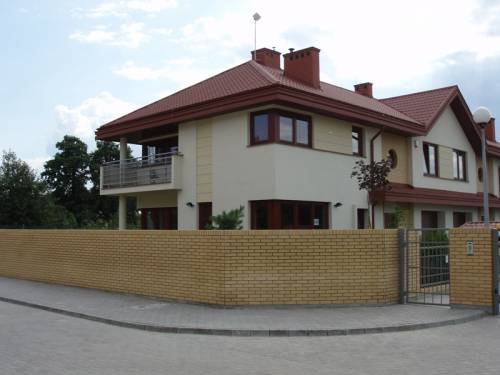 Elewacja domu: tynk zewnętrzny akrylowy o fakturze drobnoziarnistej, na filarkach międzyokiennych tynki boniowane boniami ciętymi, lokalnie płytki klinkierowe, cokoły z gresu mrozoodpornego, imitacja granitu.
