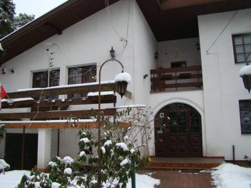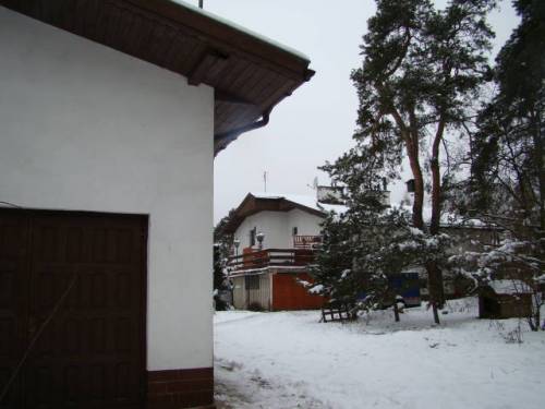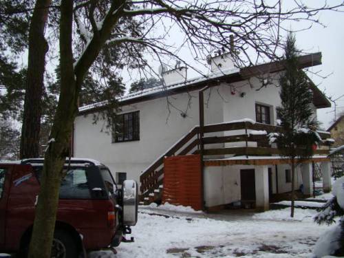 2. Budynek czterokondygnacyjny ( piwnica z garażem , kotłownią, pralnię i spiżarnią ( zimna piwnica ), parter z werandą ( łapacz ), holem, łazienką, i dwoma dużymi pokojami (parkiet ), pierwsze piętro z ogromnym salonem, wydzieloną przepierzeniem kuchnią(terakota ) i drugie piętro z łazienką dużym pokojem i dwiema sypialniami ( parkiet ). Poszczególne piętra leżą na poziomie półpięter więc faktycznie przy zagłębionej do połowy piwnicy dom ma widok piętrowy . Od strony południowej są połączone ze sobą dwa duże tarasy z pięknym widokiem na ogród .Całość domu ok. 350 m