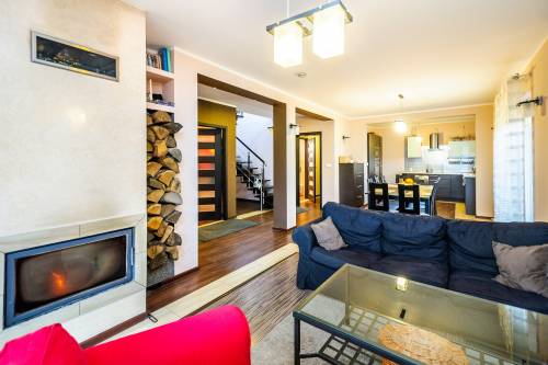 Kuchnia z jadalnią otwarta na duży przestronny salon z kominkiem o łącznej powierzchni 42m2 z wyjściem na taras.