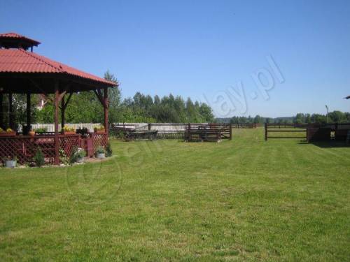 Całość posesji obejmuje : - dwa budynki mieszkalne/ 350m2 i 150m2 z 2001 - budynek usługowy/ 54m2 - stajnia drewniana ? 4 boksy oraz zagospodarowany według projektu 0,5 ha ogród a także altanę z grillem, altanę z piecem, składzik, plac zabawa dla dzieci oraz miejsce parkingowe. Tereny niezagospodarowane zajmują 1,8 hektara.