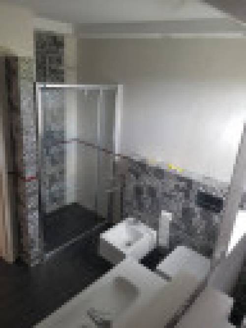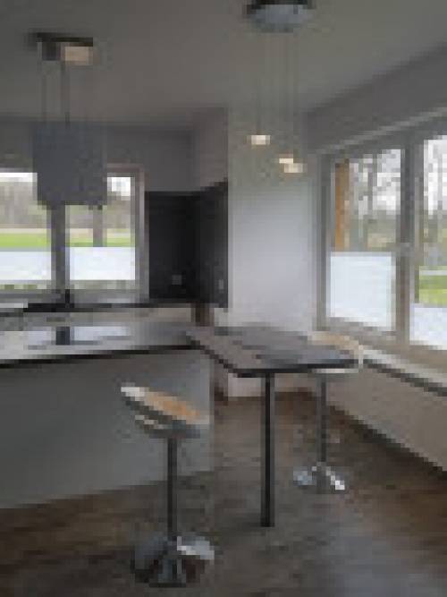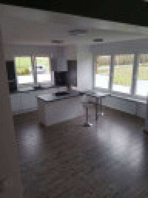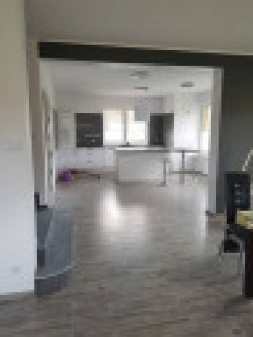 W części parterowej budynku znajduje się obszerny salon połączony z otwartą kuchnią o pow.ponad 40m2 oraz toaleta i wiatrołap. Na piętrze o pow. ok 65m2 rozplanowano dwa pokoje, sypialnia z garderobą i łazienkę z wanną oraz prysznicem, Cały parter domu oraz łazienka na piętrze z ogrzewaniem podłogowym i na podłogach w kaflach. Podłogi w domu na piętrze wyłożone panelami a w łazienkach kafle.W salonie znajduję się nowoczesny kominek. Ogrzewanie piecem na pelet. Cały dom (podłogi, jak i łazienki) urządzono nowocześnie.
