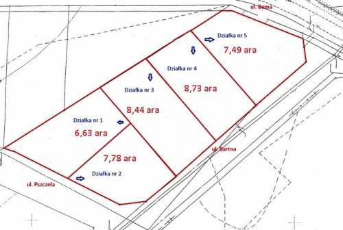 Mam do zaoferowania nieruchomość, w mieście Myszyniec, powiat ostrołęcki, która powinna odpowiadać wymogom Państwa. Działka ma łącznie 3907 metrów kwadratowych, założoną księgę wieczystą. Składa się z pięciu działek o powierzchniach, 6,63a, 7,49a, 7,78a, 8,44a, 8,73a. Na każdą posiadam warunki pod zabudowę mieszkaniową. Każda ma uregulowany stan prawny z dokumentacją konieczną do sprzedaży. Dostęp do niej jest od trzech ulic: Bema - tej głównej przy trasie na Przasnysz, Bartnej i Pszczelej. Od strony ul. Bema, położony jest chodnik. Działka jest uzbrojona, infrastruktura prąd, woda kanalizacja ściekowa , linia telefoniczna, są w pasie drogowym ulic sąsiadujących. Niedaleko - 150 metrów jest obwodnica. Wokół działki są już zabudowane osiedla i dalej ten teren się rozbudowuje. Działka jest w środku Myszyńca, ok.250m do drogi nr 53, 300m od kościoła. Dopuszczam sprzedaż działek z osobna jak i całości pod większą inwestycję sklep hurtownia zakład. Położenie i dojazd są wręcz idealne.
