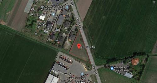 Działka o powierzchni 1526 m2 zlokalizowana w Poznaniu przy ul. Ostrowskiej, 700 m od węzła A2 Krzesiny. Działka ma kształt trójkąta. Dla działki została wydana decyzja o warunkach zabudowy przewidująca budowę hali magazynowo-handlowo-usługowej o powierzchni zabudowy ok. 500 m2. Planowane są 2 kondygnacje nadziemne. Budynek na rzucie trójkąta o bokach 35m, 50m, 35m. Przewidziano dwa wjazdy z ul. Ostrowskiej. Istniejąca zabudowa to budynki usługowo magazynowe. Cena – 480000 zł netto do negocjacji.