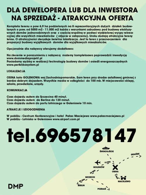 OSINA koło GOLENIOWA woj Zachodniopomorskie. Sam teren przy drodze asfaltowej gminnej z bardzo dobrym dojazdem. Wszystkie media w odległości do 100 mb. W miejscowości sklepy, szkoła, przedszkole, urzędy.