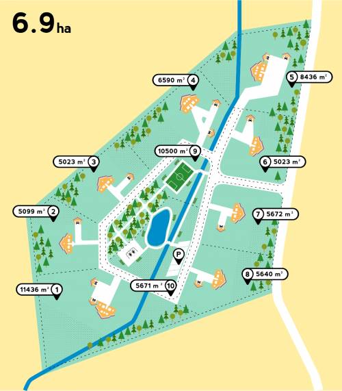 Kompleks terenu o pow 6,9 ha podzielonych na 8 reprezentacyjnych dużych działek budowlanych o pow. od 5000 m2 - 11.000 m2 każda z warunkami zabudowy pod budowę ekskluzywnych domów jednorodzinnych oraz z częścią wspólną w postaci wydzielonej wyspy rekreacyjnej dla wszystkich mieszkańców ( zdjęcie w załączeniu). Uroku dodają atrakcyjne tereny leśne. O atrakcyjności decyduje świetna lokalizacja. Jest to teren z przeznaczeniem dla propozycji budowy wyjątkowych domów dla wyjątkowych mieszkańców.