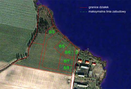 Działki 8/5 i 8/6, z własną linią brzegową, mają możliwość zabudowy już w odległości 15m od jeziora.