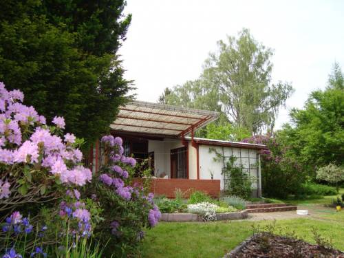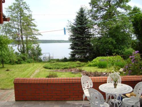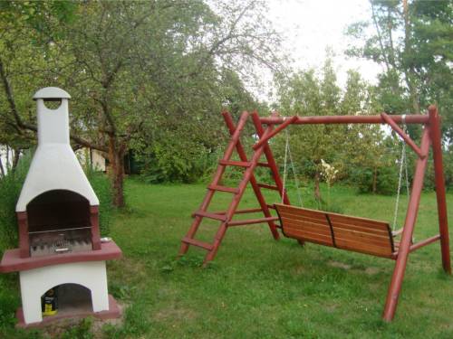 Działka na której stoi domek jest otoczona zielenią, znajduje się tam huśtawka ogrodowa, grill. Z działki jest wyjście na prywatny pomost.