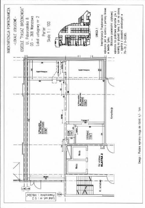 Lokal ten znajduje się na parterze w nowo wybudowanym kompleksie mieszkaniowym, który w połączeniu z wcześniej istniejącym już kompleksem stanowi ponad 1000 lokali mieszkalnych + lokale handlowo-usługowe. W pobliżu znajduje się galeria handlowa ?Galeria Rembielińska? i park bródnowski co zapewnia dużą liczbę potencjalnych klientów prowadzonej tam działalności gospodarczej.