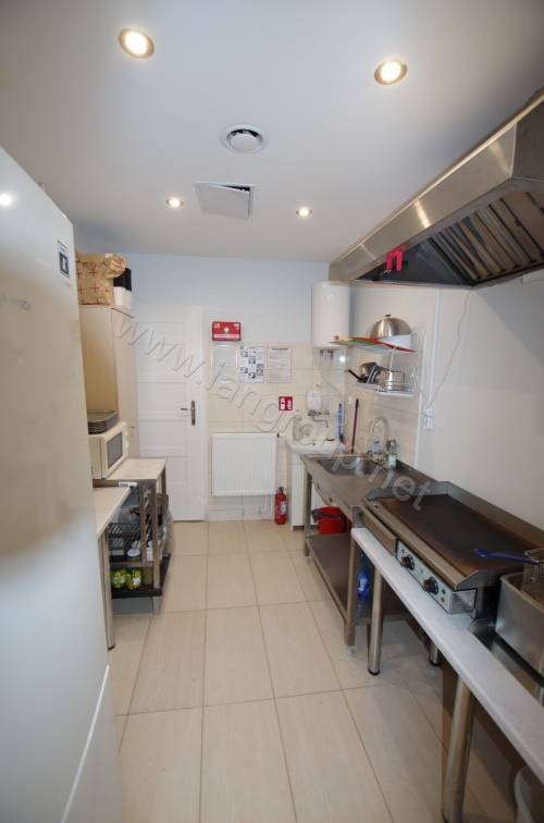 Kuchnia wyposażona jest w lodówkę, szafki kuchenne, okap – wyciąg, piekarnik, płyta grillowa elektryczna, frytkownica, mikrofalówka,